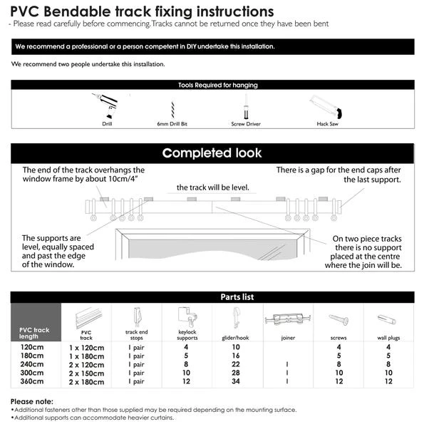 | Pack Contents | Lengths 120, 180cm: 1 x Track, Gliders, Brackets, Fittings; Lengths 240, 300, 360cm: 2 x Tracks, Connector, Gliders, Brackets, Fittings |