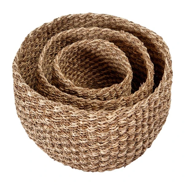 Pacific Lifestyle Set Of 3 Plaited Natural Seagrass & Palm 2-Toned Round Baskets